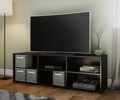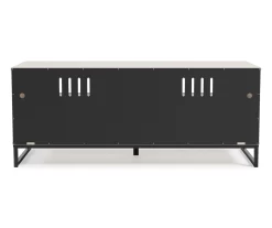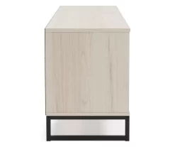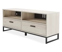 Light and bright, the Socalle TV stand is inspired by chic design. A light natural finish over replicated oak grain offers an authentic touch. Open shelving and two smooth-gliding drawers provide handy storage, while metal legs and pewter-tone handles bring an edgy flair.
