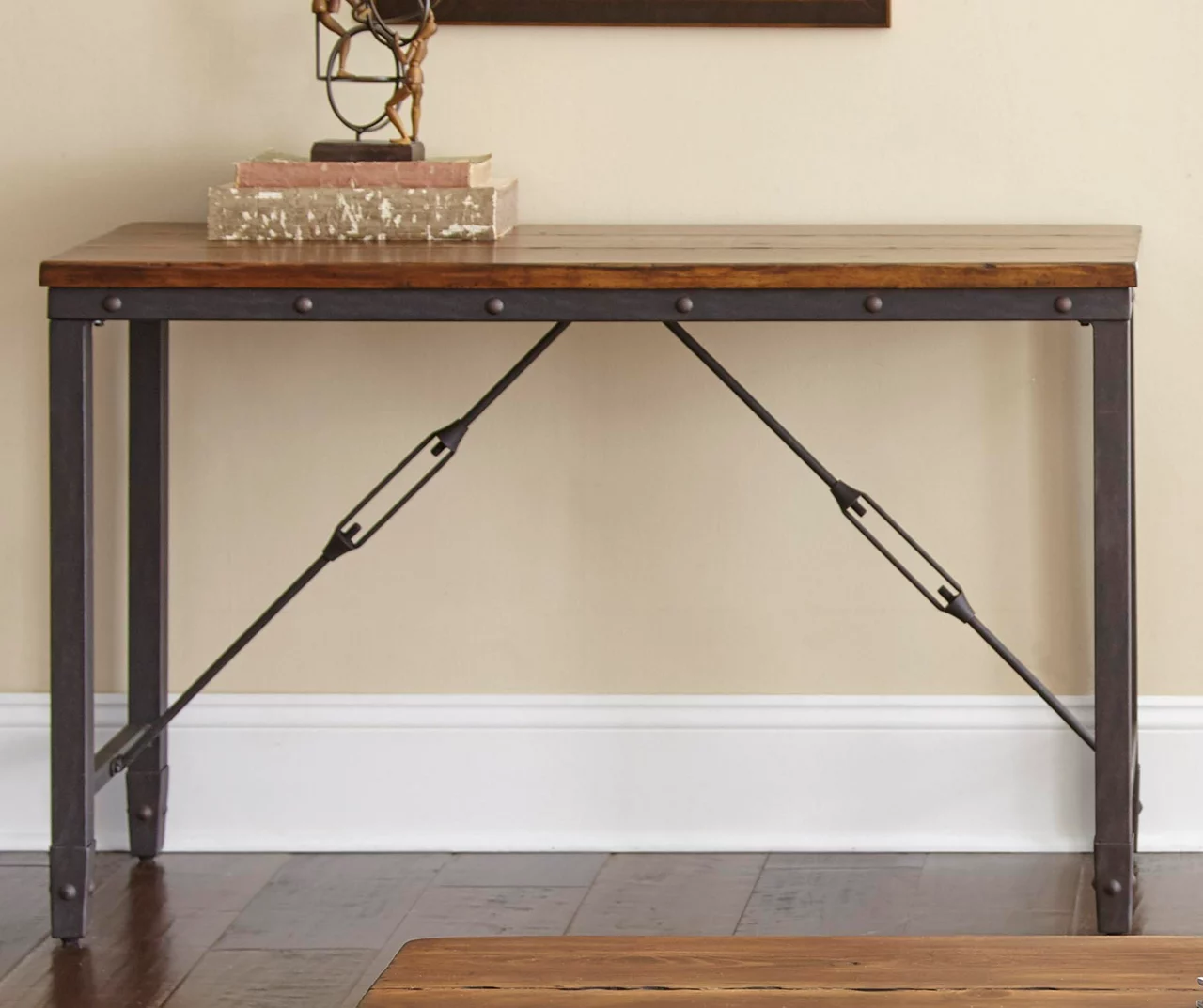 - Rustic-meets-industrial console sofa table with cable stretcher accents