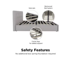 Soft and comfortable, the Ryder upholstered bed with storage is perfect to cozy up any bedroom décor. Its linen upholstery, button-tufted details and foam padding are reminiscent of mid-century style. Dress it up with throw pillows and blankets and you’ll never want to leave your room again! What’s more, the Ryder has drawers for added storage convenience. It also equipped with a bentwood slat system that will provide your mattress with the ventilation it needs to stay fresher, longer. The four contemporary legs and the extra center legs provide the additional support you need.