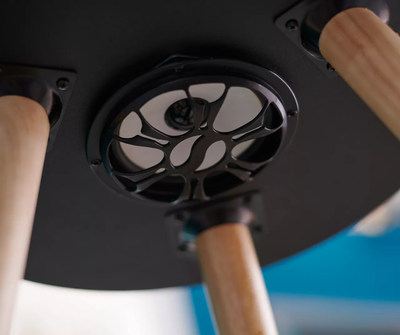 - Black round side table with hidden Bluetooth speaker