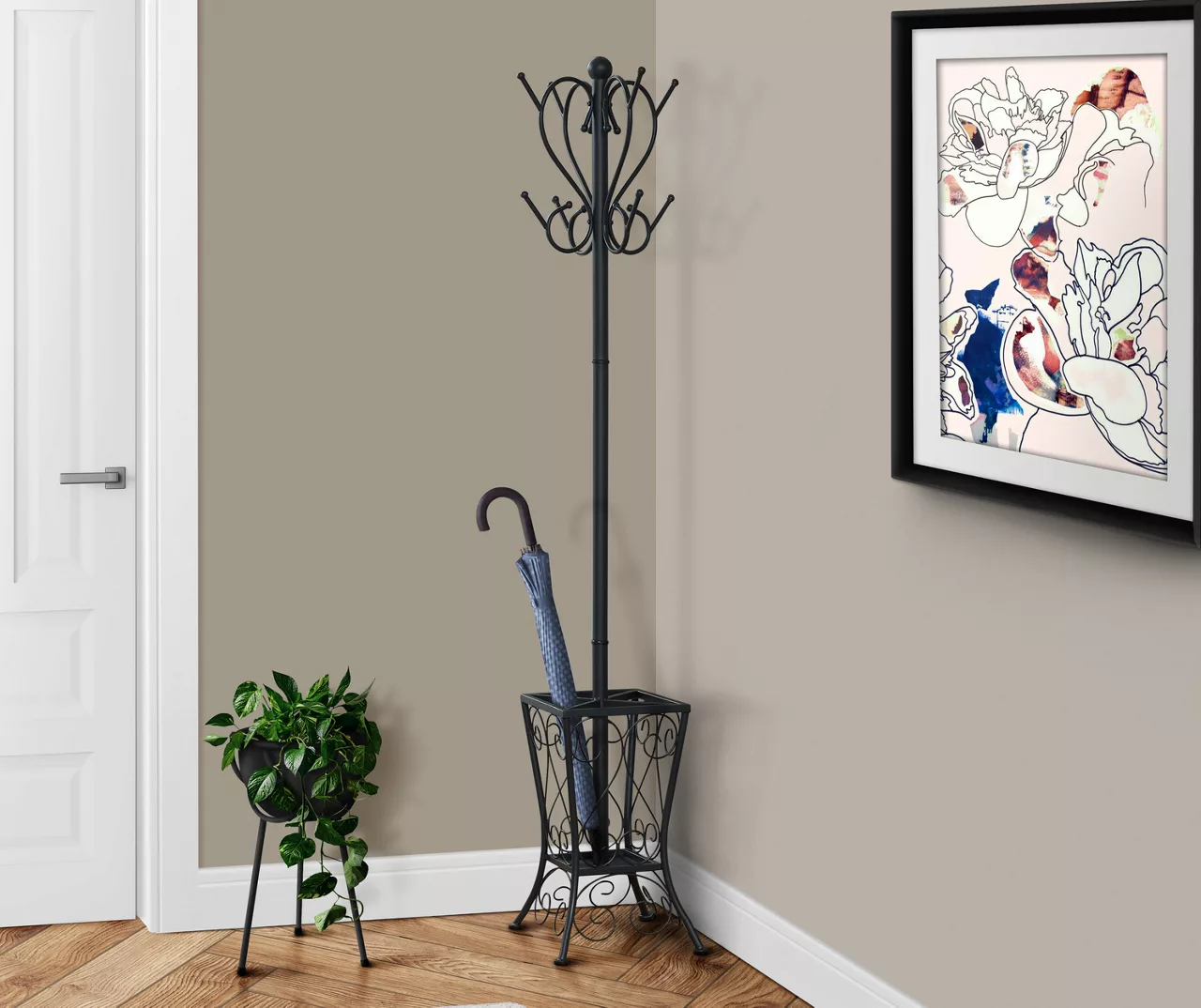 Enhance the look of your entryway or hallway with this black metal coat rack and umbrella stand. The two tiers with a total of eight curved hooks paired with an elaborately scrolled basket offers the perfect place to store hats, jackets, scarves and umbrellas. The classic appeal of this coat rack lends itself to a stylish elegance reminiscent of a romantic Parisian apartment that will provide you with years of lasting enjoyment.