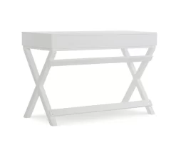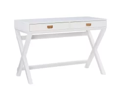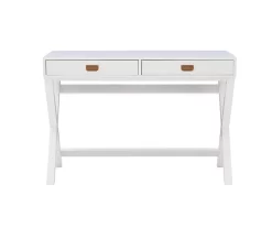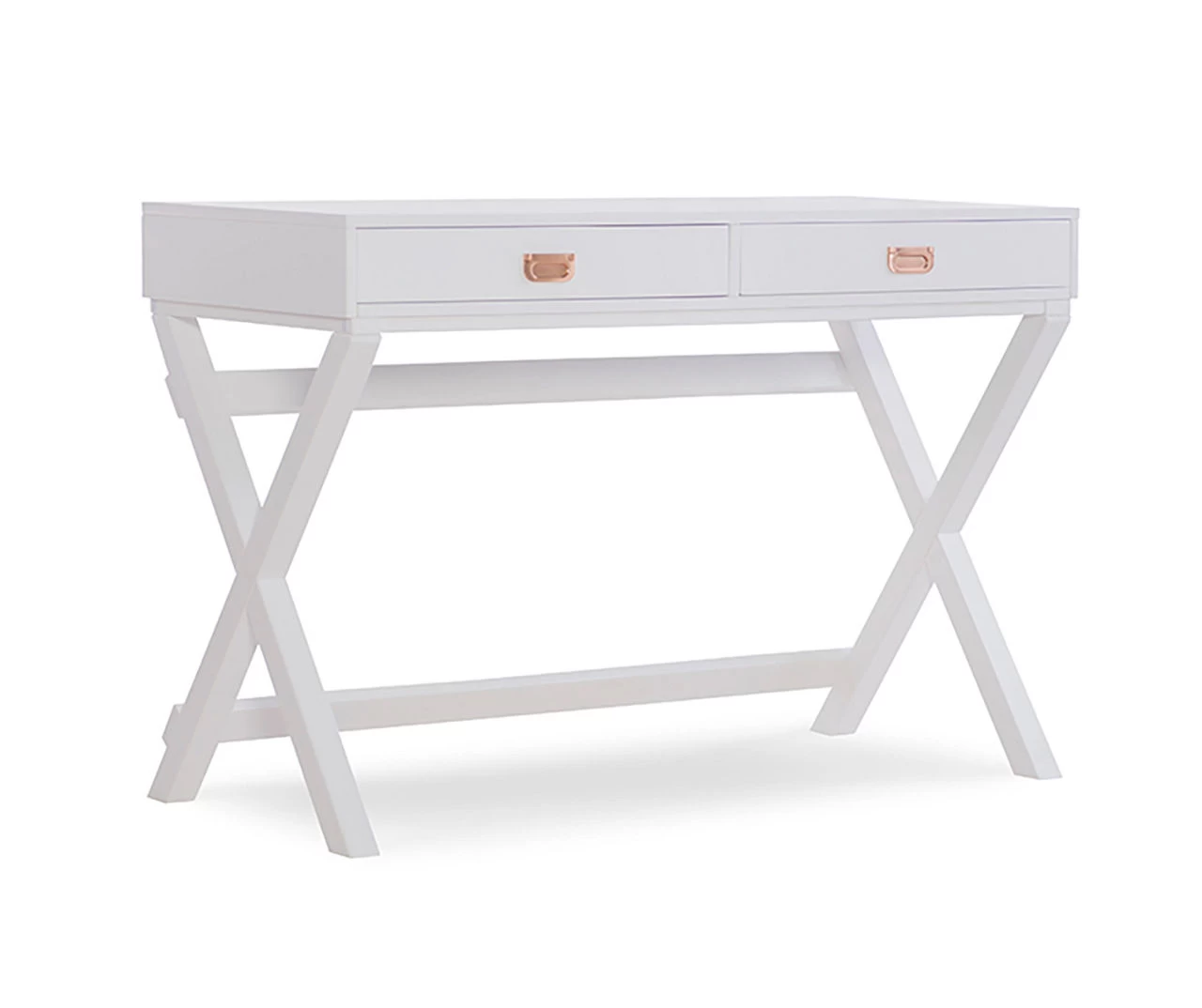 Refresh your home with this chic writing desk featuring sleek lines of an X-Base accented by rose gold hardware. The crisp white finish brightens the space while effortlessly complementing your existing color scheme. A large work area offers ample space for a computer, books and a lamp. Two drawers offer storage space for smaller items. Design your ideal room and create an energetic look by pairing this piece with others in the collection.