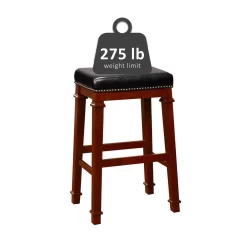 Gleaming bronze nailheads accent the black faux leather upholstery on this backless bar stool with a crisp shine that brightens any space. Traditional design and materials make this stool an ideal choice for a rustic, farmhouse or traditional space while the clean, sharp lines also suit contemporary spaces.
