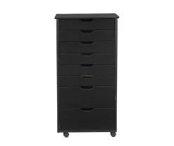 This eight-drawer rolling storage cart is a versatile storage solution for your office, kitchen, bedroom or anywhere where organization is needed. Solidly constructed from pine wood and finished in a handsome black, the six equal size and two deep drawers are finished with an ample top that can go next to a desk or craft table to put items within reach. Soft contoured handle cut outs are easy on the touch and create a clean, modern look. Drawers can be easily removed and used as a tray to transport your items to your workspace, while casters make this piece mobile to go into any room easily.