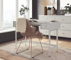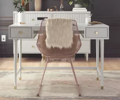 The contemporary chic design of the Elizabeth desk melds perfectly with mid-century modern contours to create an instant focal point in any room. It’s fabulously designed with two ribbed, textured drawers adorned with glam gold drawer pulls that are perfect for tucking away sparkly gel pens, reading materials or a journal to achieve an organized workspace. Constructed from durable painted MDF, the Elizabeth desk beautifully sits atop tapered solid wood legs, nestled in gold capped feet, creating a sophisticated and polished look, fit for a modern-day royal like yourself.