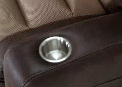 Maximize the level of your comfort with this amazing recliner. Sophisticated faux leather upholstery in a rich brown lines the chair with contrasting stitching as Aerotech fiber panels along the backrest create better air flow for increased relaxation. Fully padded and featuring a stainless steel cup holder for keeping your favorite beverage close by, it’s great for lounging in the study, family room or living room.