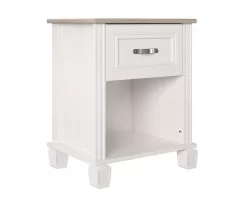 The Glendale Estates nightstand features a fresh traditional styling that creates a handsome functional piece that is impressive, yet approachable. Hickory veneers are enhanced by a distressed white finish. This nightstand provides three drawers for concealed storage as a USB port keeps devices charged.