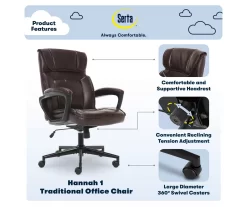 Get more done—and feel great doing it—in the Hannah I office chair by Serta. With a cushioned, contemporary profile, its designed with comfort in mind with adjustable height and recline tensions. Its waterfall seat edge is curved to lessen back pressure and increase circulation. The design makes it suitable for many types of office decor, from modern to traditional. Its classic brown bonded leather s accented by a black frame to improve any office’s decor aesthetic. The padded arms provide support and comfort, highlighting its ergonomic design. The sturdy 5-point base features castor wheels that are ideal for hard-surface floors.
