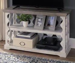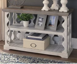 With its richly rustic finish and textural mix, this console table goes to town on modern farmhouse style. Distressed two-tone treatment blends a weathered gray with vintage white for an utterly charming effect. Balustrade-style planks supporting the top create an eye-catching look that’s anything but ordinary.