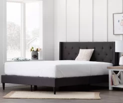 - Wingback headboard has an upholstered charcoal fabric finish with diamond button tufting