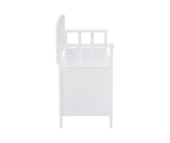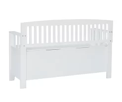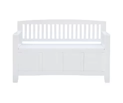 Create added seating and storage to your entryway, mudroom, bedroom or living room with this attractive and sturdy storage bench. The bench features a flip top lid with no-slam hardware, allowing for easy access to items you want out of sight. The slat designed back and armrest are finished in a glossy white paint allowing it to be used with virtually any decor. Add a colorful seat cushion or your favorite accent pillows to brighten up the room.