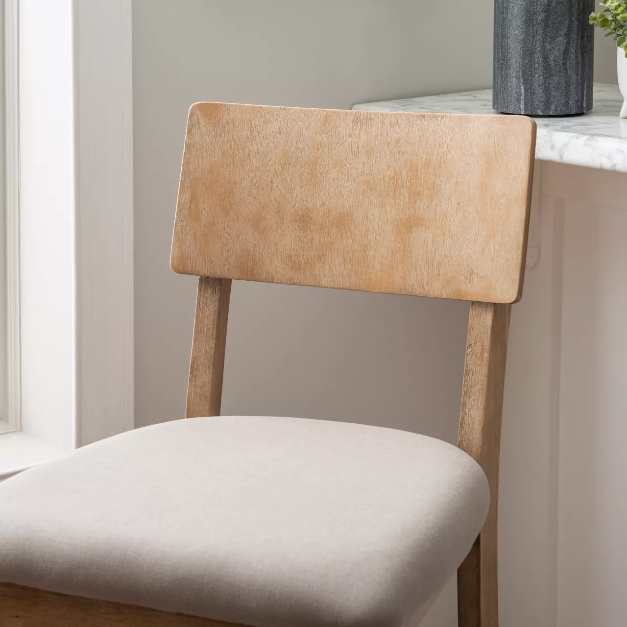 Classic simplicity and neutral finishes gives this bar stool endless versatility. A thick, padded seat upholstered with a soft linen blend offers exceptional comfort while the foot rests increase stability. Suitable for any style and color scheme, this stool will fit right in with any aesthetic.