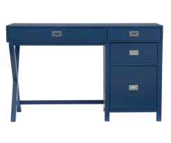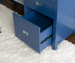 Gain new levels of control over your productivity and organization with this sleek desk and storage combination. The design provides an ample workspace without overcrowding your home office or bedroom. Three drawers and a larger storage drawer are seamlessly tucked under the desk and equipped with shiny silver metal handles. The modern blue finish pairs well with today’s cutting edge decor, but is subtle enough to blend with almost any other setting.