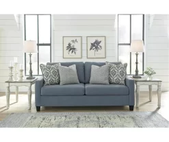Sporting a two-over-two box cushion design for a clean and uncluttered aesthetic, this sofa is a lovely choice in contemporary furniture. Elements include slim track arms with angled flair, sleek tapered feet and a feel-good flatwoven twilight blue upholstery that’s a refreshing change from the everyday ordinary. Assorted throw pillows in mellow, muted tones incorporate an updated farmhouse look.