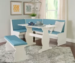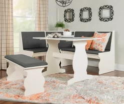 Create cozy kitchen comfort even in the tiniest of spaces with this lovely Maggie dining nook! Padded seating in charcoal gray pairs well with the classic white look of the set’s pine constructed frame. Generously sized to accommodate up to five people, this wonderful furniture set is perfect for any corner of your kitchen.