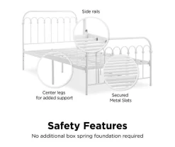 - Includes bed frame, headboard, footboard, metal side rails, center metal rail, center legs and metal slats