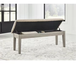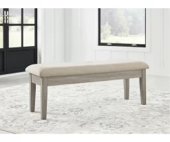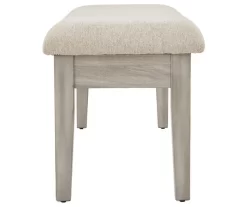 Bring a relaxed-yet-refined sense of good taste to a space with this wonderfully comfortable upholstered dining bench. An inspired choice for modern farmhouse living, its clean-lined frame sports a gray finish that’s so easy on the eyes. The bench’s cushioned upholstered seat, covered in a complementary textured beige fabric, goes easy on the body. Tuck your treasures out of sight with hidden storage under the seat.