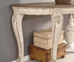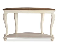 Elevating the art of traditional cottage styling, this demilune console table is sure to serve you beautifully for years to come. Antiqued two-tone aesthetic blends a chipped white with a distressed wood finished top for added charm. Classic cabriole legs and shapely lower shelf are a lovely twist.