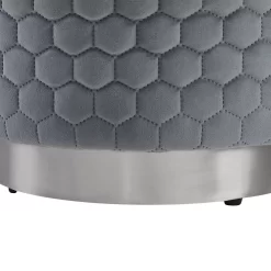 Subtle yet elegant. Fabulous accent stitching of the woven grey quilted fabric creates an sophisticated overall pattern that is pleasing to the eye and soft to the touch. The metal band along the base in silver adds a touch of luxury. Sitting 16.5 inches off the floor, this glamorous stool can fit under a make up vanity, bathroom prep table, desk or really, anywhere. Arrives fully assembled and ready to add a pop of color to any room.