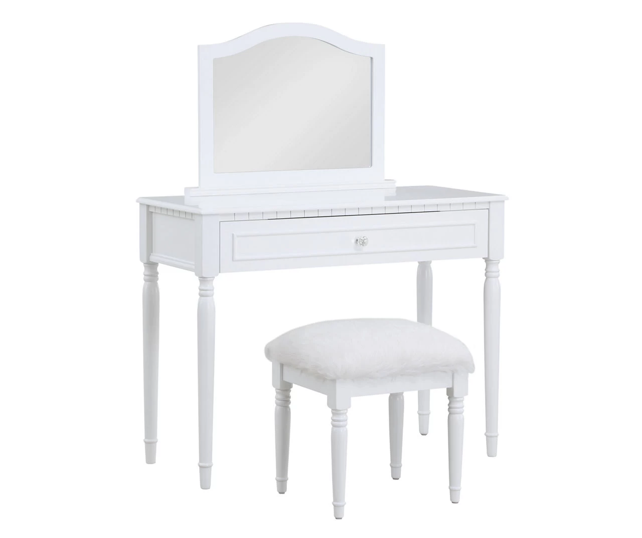 Get ready for the day in elegance at this vanity table set. A luxurious silver finish accents the tabletop, turned legs and matching frame stool as a white faux fur adorns the seat cushion. A single mirror helps with hair styling and makeup application as a large drawer, fitted with a crystal drawer knob, offers concealed storage for your items.
