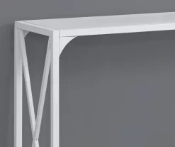 This two tier console table offers a stylish way to decorate narrow spaces, like an entryway or a hallway. Use the tabletop to display picture frames and special keepsakes, or to drop your keys and mail when you arrive home. The generous space between the tabletop and bottom shelf provides an ideal place for tall décor items, such as flower vases or photographs. A slim white metal frame outlines the tabletop and shelf panels that are in a smooth white finish, while X-shaped accents on the sides of the frame add a decorative flair. Long, narrow, and tall, this accent table fills a ton of roles in any living room thanks to its versatile design.