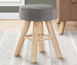 Simple in design but varied in function, this ottoman is a resourceful sidekick for a sofa or chair in a living room or bedroom. As a foot stool it’s a soft place to kick up your feet, as a makeshift table it’s a convenient surface to lay down a book or mobile device, and as a portable stool it’s an extra seat where and when you need it. The round padded seat offers a comfortable feel and is upholstered in a beige knit fabric for a distinctive look. Slanted, cylindrical wood legs and footrests provide support and have a natural color that coordinates with most décors.